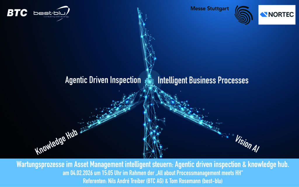 In diesem Rahmen halten unsere Kollegen Nils André Treiber (BTC AG) und Tom Rosemann (best-blu) einen Vortrag zum Thema: „Wartungsprozesse im Asset Management intelligent steuern: Agentic driven inspection & knowledge hub“ und erklären Ihnen anhand einer Windkraftanlage, wie durchgängige Prozesse Mehrwerte generieren können.